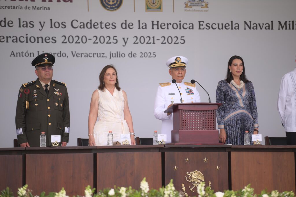 Alvarado, Ver., viernes 25 de julio de 2025.- En acto solemne la gobernadora Rocío Nahle García asistió como madrina e invitada de honor del secretario de Marina, Raymundo Pedro Morales Ángeles, a la ceremonia de graduación de las generaciones 2020-2025 y 2021-2025 de la Heroica Escuela Naval Militar, ubicada en Antón Lizardo.