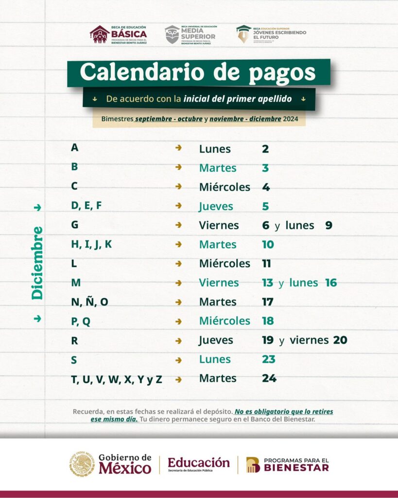 Xalapa., Ver. 2 de diciembre de 2024.- Tal como lo anunció la Presidenta de México, Claudia Sheinbaum Pardo y el Secretario de Educación, Mario Delgado Carrillo, en la mañanera del pueblo, en este mes de diciembre inicia el pago de las Becas para el Bienestar de las y los beneficiarios de continuidad de las Becas para el Bienestar de los 3 niveles educativos. El periodo de pago será del lunes dos de diciembre al martes veinticuatro de diciembre y se realizará el depósito de los dos últimos bimestres del año (septiembre – octubre y noviembre – diciembre).