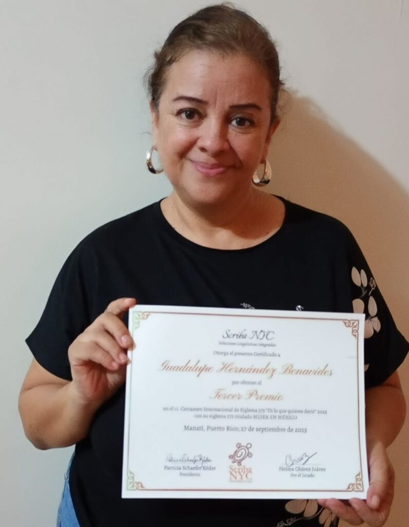 AGUA DULCE, VERACRUZ (4 DE NOVIEMBRE DEL 2025).- La poetisa veracruzana y promotora cultural, Guadalupe Hernández Benavides, obtuvo el tercer lugar en la 11ava edición del Certamen Siglema 575 «Di lo Que Quieres Decir edición 2025″, un concurso internacional de poesía minimalista.
