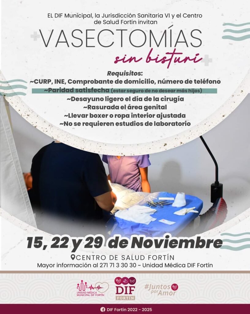 Home » 🏥 El DIF Municipal de Fortín, la Jurisdicción Sanitaria VI y el centro de salud, los invita a participar en la “Jornada de Vasectomías sin bisturí” totalmente gratuitas, con el objetivo de fomentar la planificación familiar.