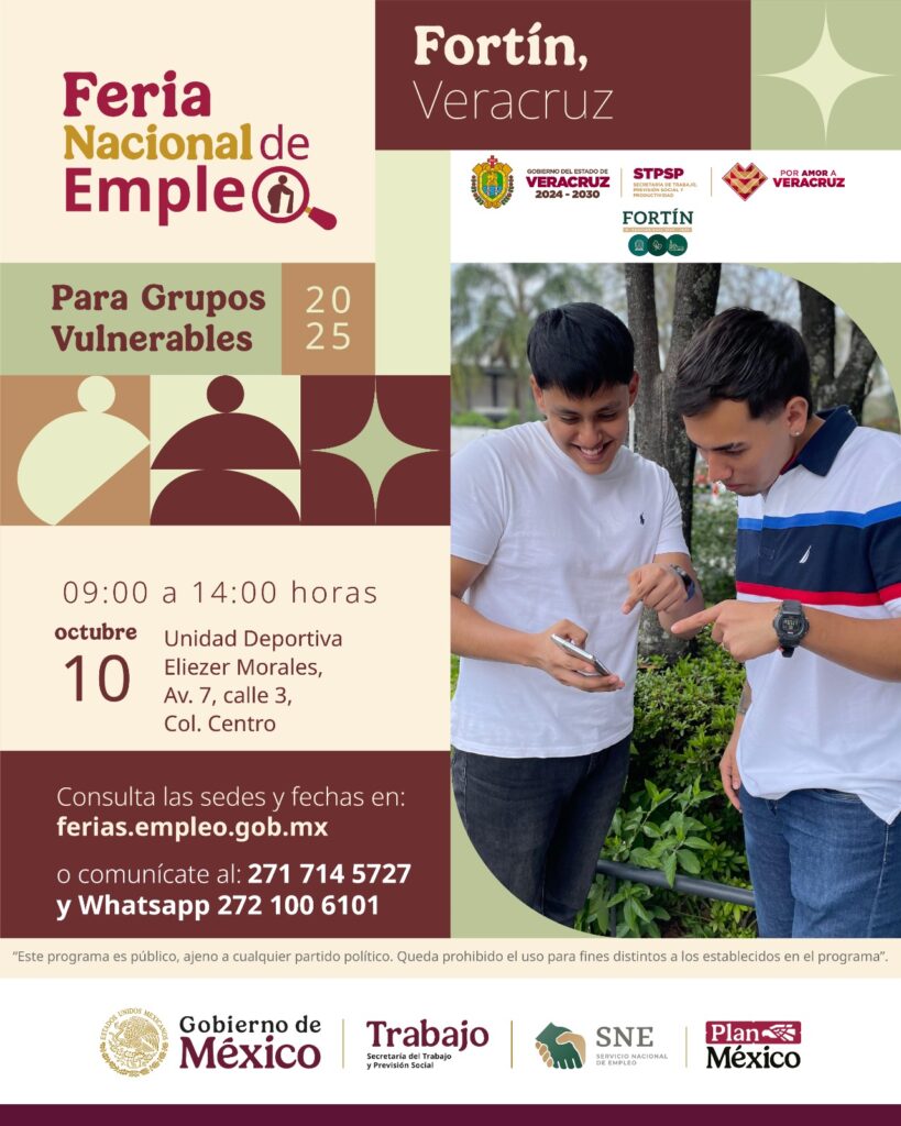 ✨La Secretaría de Trabajo, Previsión Social y Productividad, a través del Servicio Nacional de Empleo Veracruz y en coordinación con el H. Ayuntamiento de Fortín, invitan a la Feria Nacional de Empleo, dirigido a la población en general donde habrá oportunidades para grupos vulnerables.