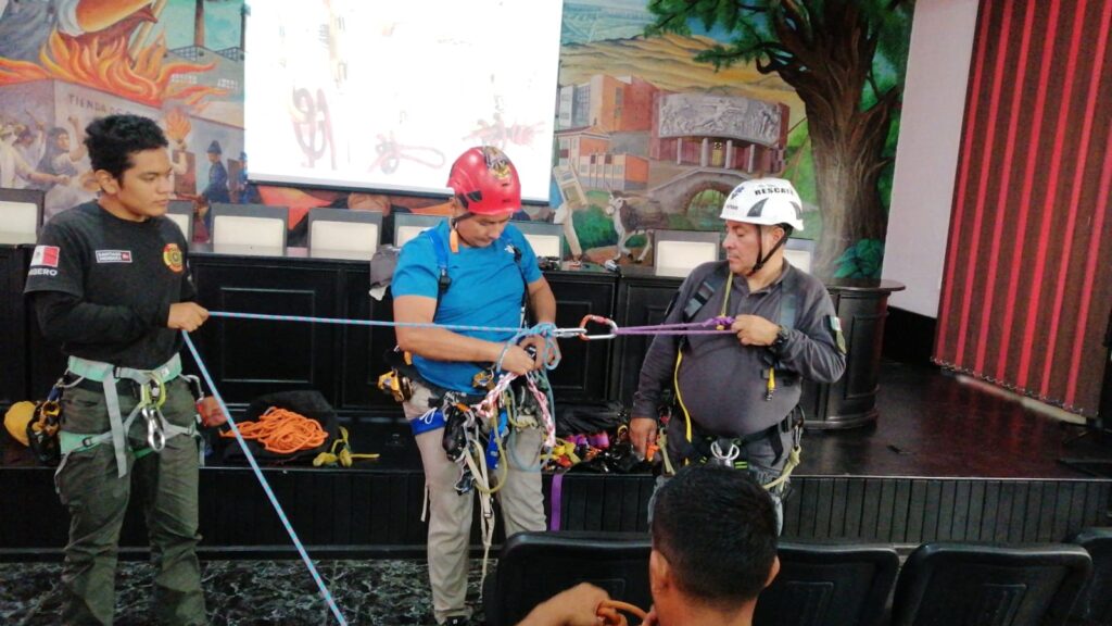 Uno de los temas importantes fue el rescate en ascenso y descenso a rapel con cuerda fija, en donde Palma Déctor, les ofreció las técnica básicas y señaló importante que cada rescatista cuente con su equipo, necesario para participar en algún rescate de víctima, como es el caso de casco, arnés, mosquetones, y dispositivos leva.