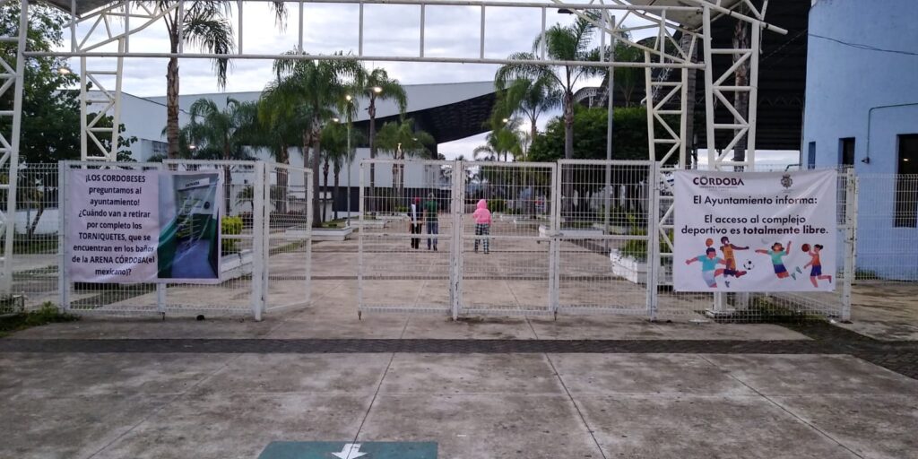 Córdoba, Ver.- Vecinos de Santa Margarita, colonia México, Los Filtros, Toxpan y aledaños colocan mantas en las afueras de las canchas del complejo deportivo “EL MEXICANO” para preguntar a las autoridades cuándo van a retirar por completo los torniquetes que se encuentran en los baños de la Arena Córdoba?