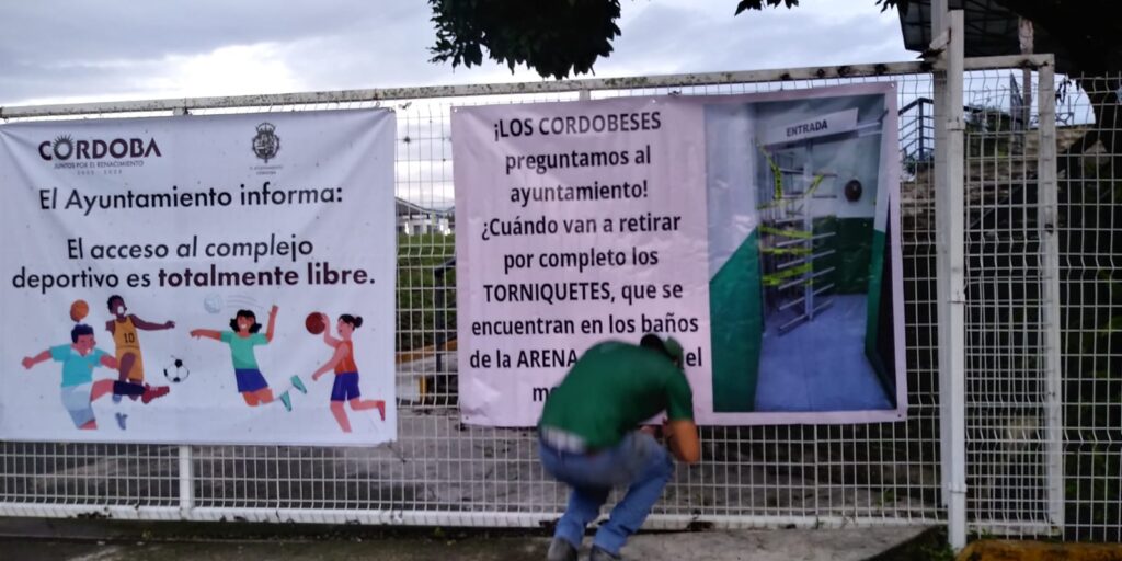Estas lonas, se colocaron junto a las que desde la semana pasada el Ayuntamiento colocó en la entrada a las canchas del Mexicano para informar: El acceso al complejo deportivo es totalmente libre. Esto como una acción en espera a las demandas de los vecinos, quienes esperan que retiren los torniquetes que están en los baños, pues de no retirarlos indica que en cualquier momento puedan activarse.