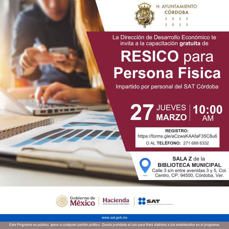 Córdoba, Ver.- Este jueves 27 de marzo, el SAT de Córdoba ofrecerá una plática acerca del Régimen Simplificado de Confianza (Resico) por lo que los interesados en participar pueden acudir a las oficinas de Desarrollo Económico y se apoye a los emprendedores y a las Micro, Pequeñas y Medianas Empresas de la ciudad.
