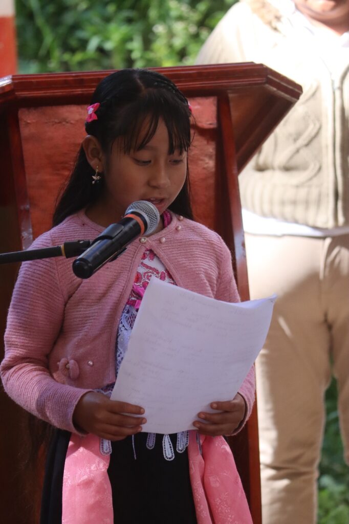 En representación de sus compañeros, una alumna leyó un mensaje de agradecimiento en dialecto Náhuatl y en Español, quien dijo estar contenta por este uniforme que año con año recibieron gratuitos.