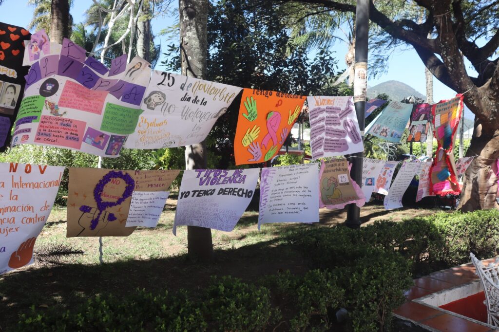 Entre los pasillos del parque se exponen carteles elaborados por estudiantes, con mensajes de reflexión, concientización y lucha contra esta problemática social.