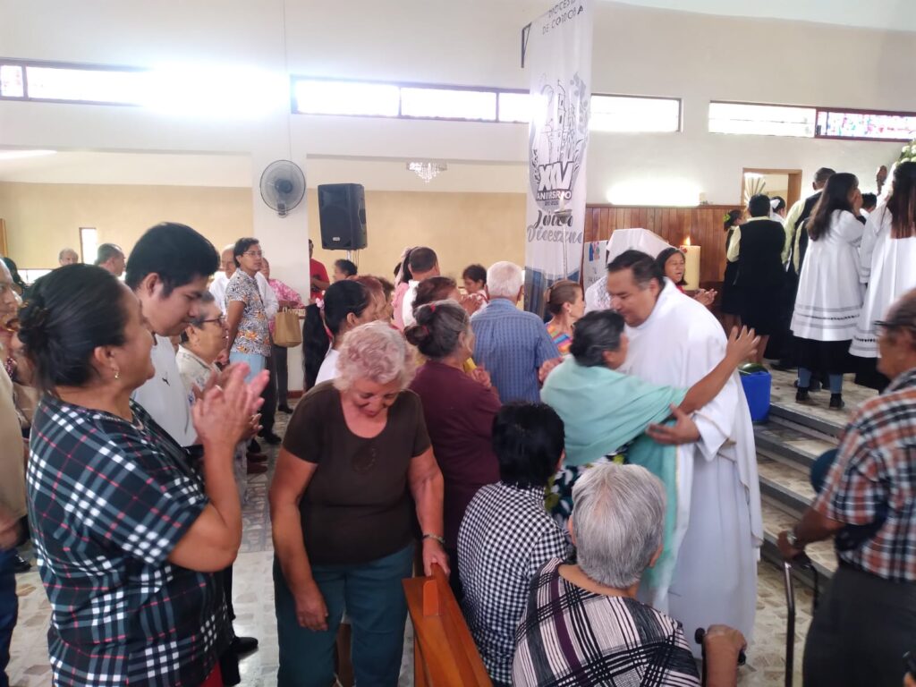 Córdoba, Ver.- Un emotivo recibimiento tuvo el padre bombero, Oscar Fabricio Martínez Limón, en la iglesia de la Santa Cruz, en la colonia Buena Vista luego de recibir la rectoría de manos del obispo de Córdoba, monseñor Eduardo Carmona, quien concelebró la eucarística con la presencia de padres de la diócesis.