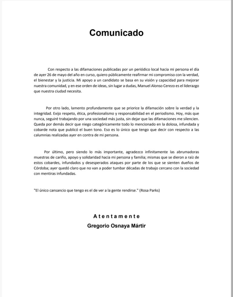 «Hoy más que nunca estaré trabajando por una sociedad justa, sin dejar que las difamaciones me silencien. Queda por demás que niego categóricamente todo lo mencionado en esa dolosa, infamada y cobarde nota que publicó el periódico de circulación local.