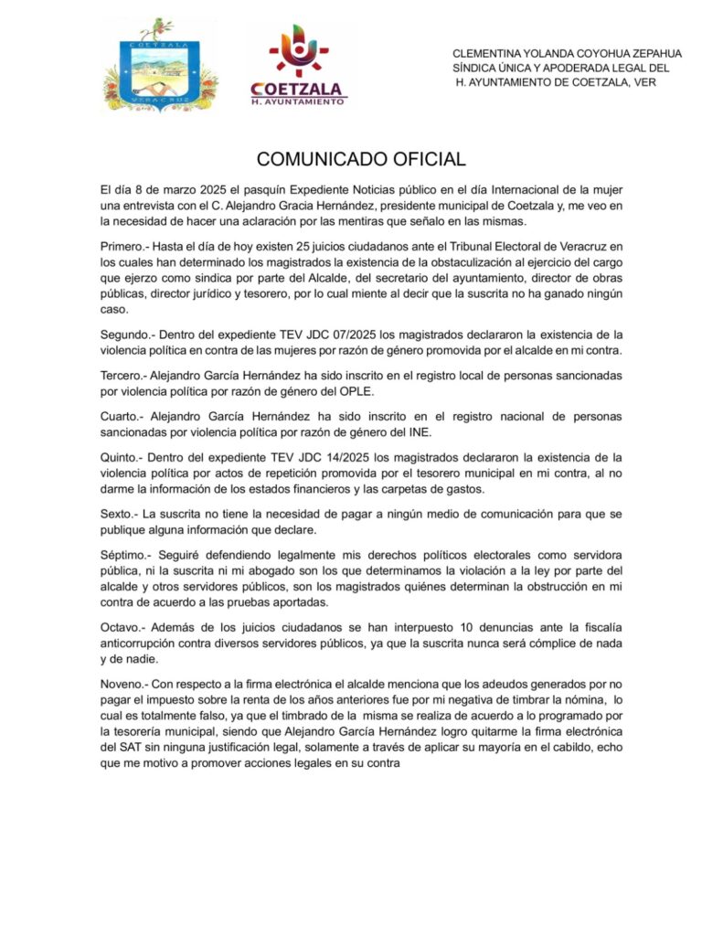 El pasado 8 de marzo, en el marco a la conmemoración del Día Internacional de la Mujer, a diversos medios de comunicación el primer mandatario de Coetzala ocultó los 25 juicios que enfrenta ante el Tribunal Electoral de Veracruz, quienes han determinado la existencia de poner obstáculos al ejercicio del cargo que ejerce la Síndico.