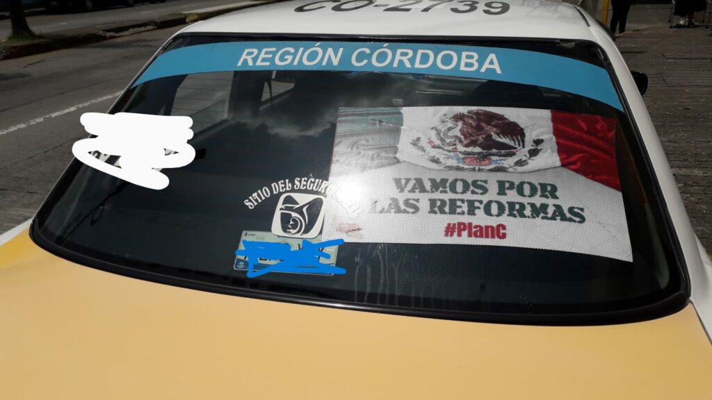 Córdoba, Ver.- Trabajadores y concesionarios de taxis dieron a conocer que desde este viernes 13, Transporte Público del Estado dio la orden de pegar en sus unidades calcomanía con la leyenda “vamos por las reformas. #PlanC”.