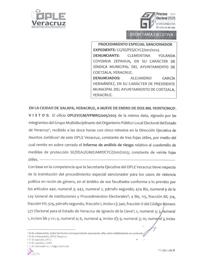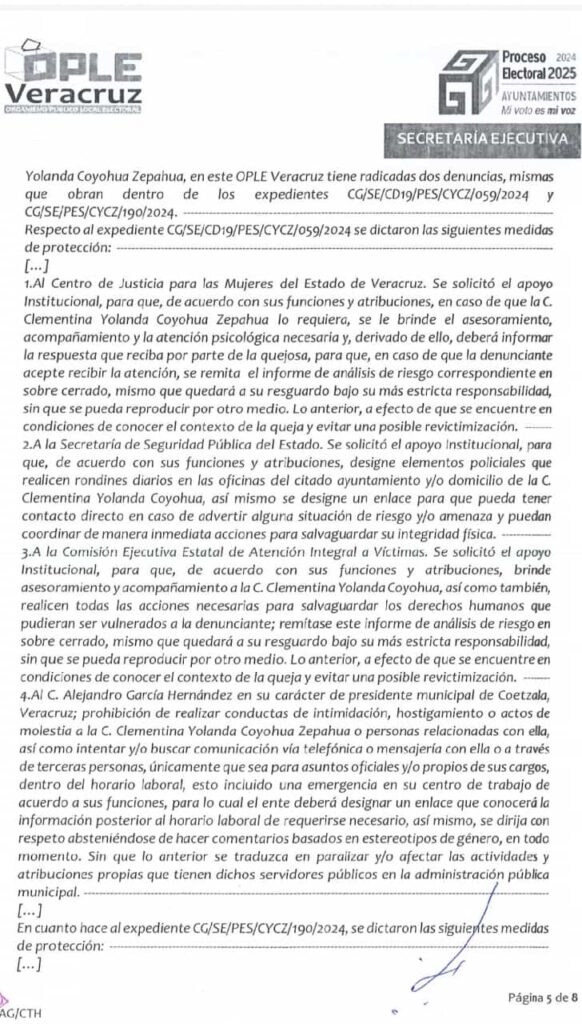Coetzala, Ver.- Otorga el Órgano Público Local Electoral (OPLE) medidas de protección a Clementina Coyohua Zepahua, síndico del Ayuntamiento de Coetzala dentro del procedimiento especial sancionador promovido por Violencia Política en razón de Género en contra de Alejandro García Hernández, presidente municipal.