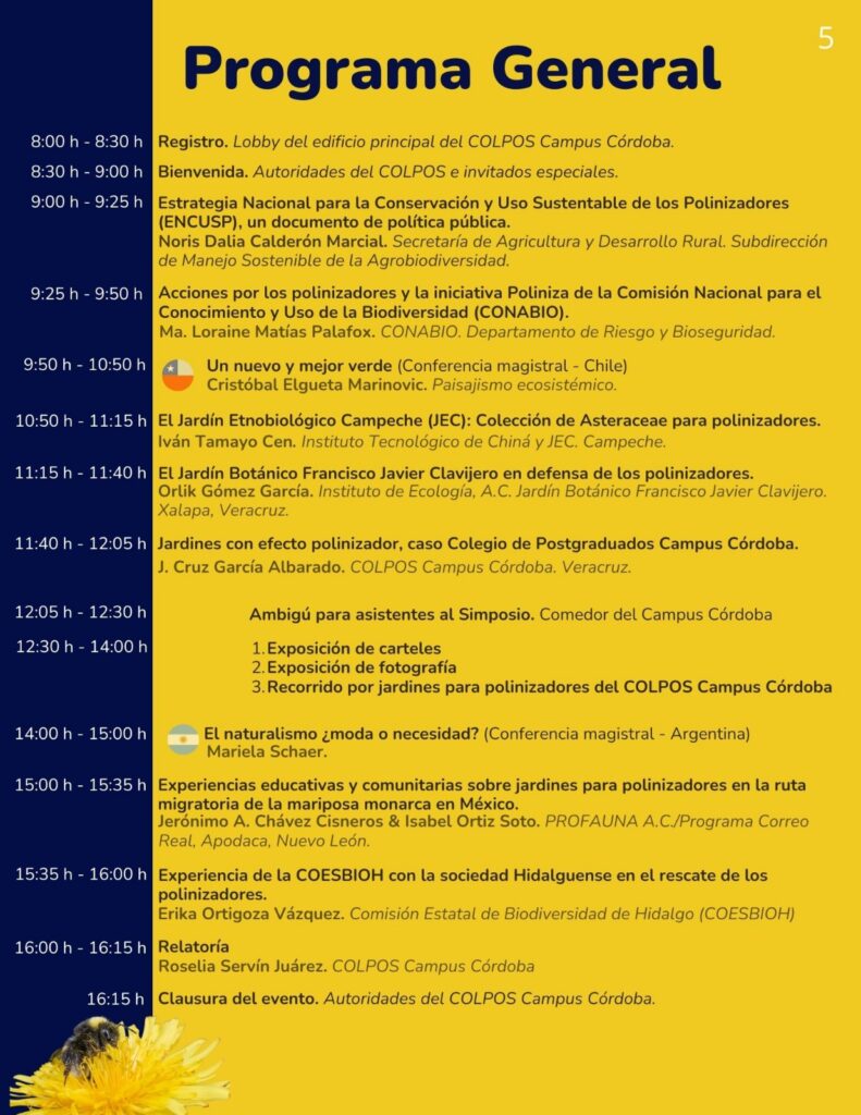 Las actividades iniciarán a partir de las 8:00 horas con el registro de asistentes, quienes podrán de disfrutar de forma gratuita de las conferencias, una muestra de carteles científicos y de fotografías, así como de un recorrido por los jardines para polinizadores del Campus Córdoba del Colegio de Postgraduados.