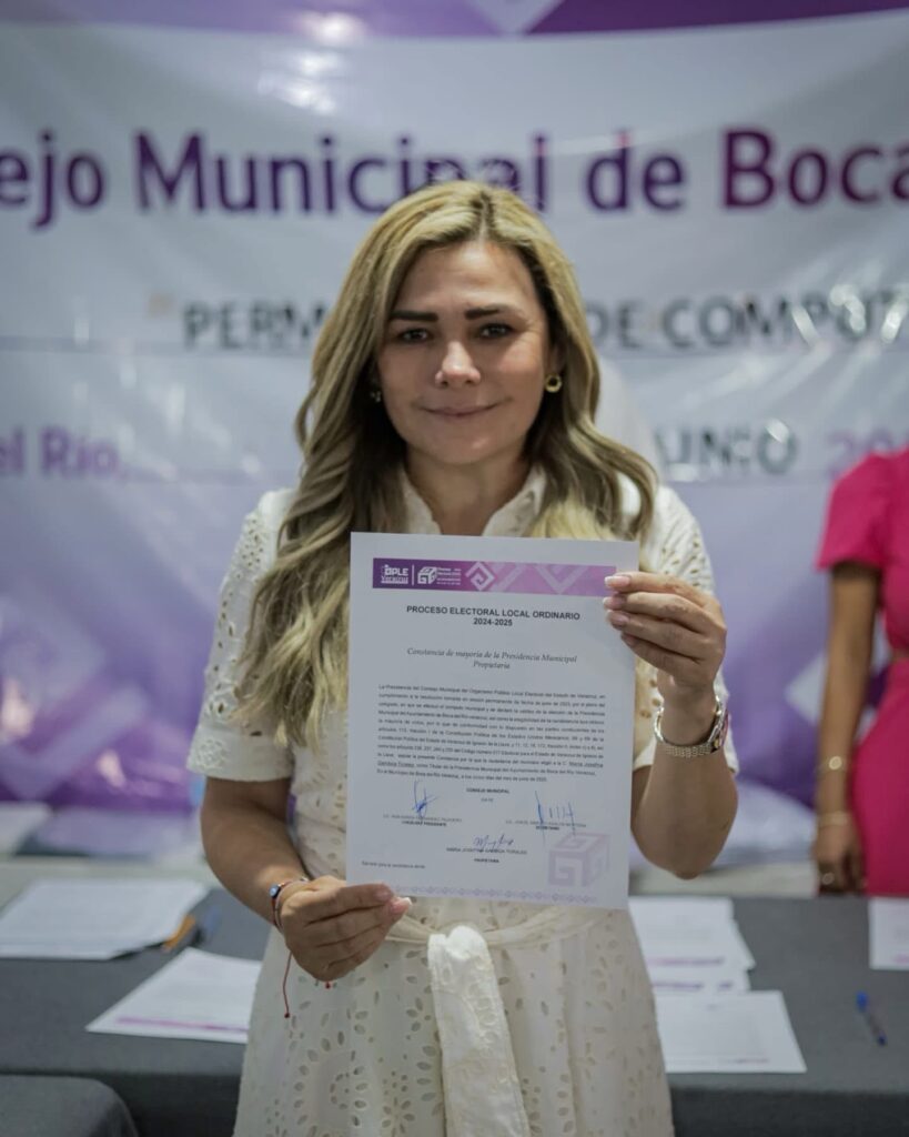 Boca del Río, Ver., 6 de junio de 2025.– En las primeras horas de este jueves, Maryjose Gamboa recibió oficialmente la constancia de mayoría que la acredita como presidenta municipal electa de Boca del Río, luego de que concluyera el proceso de recuento total de votos en el Consejo Municipal del OPLE.