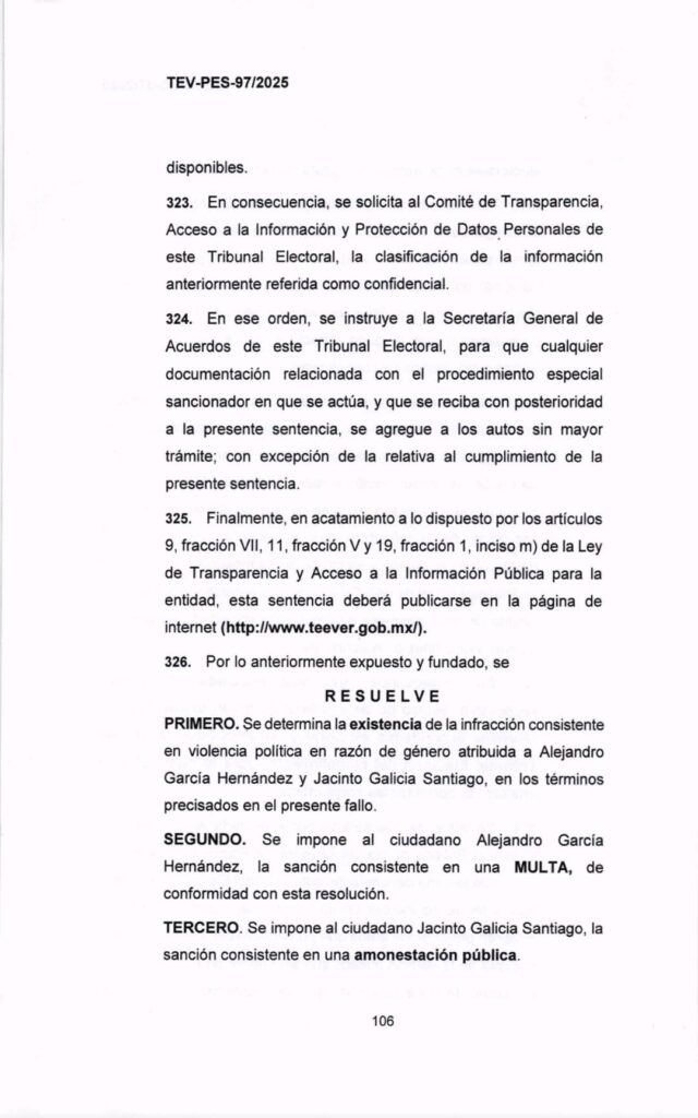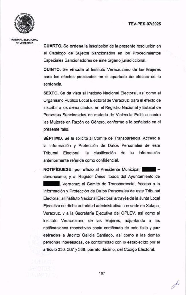 Como sanción, el TEV ordenó la inscripción de los infractores en el Registro Nacional y Estatal de Personas Sancionadas en materia de Violencia Política contra las Mujeres:
