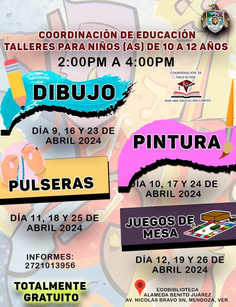 Todo este mes de abril, desde la Coordinación de Educación y Cultura, se brindan talleres de pintura, dibujo, pulseras artesanales y juegos de mesa, en diferentes fechas y en horario de 2 a 4 de la tarde, son totalmente gratuitos.