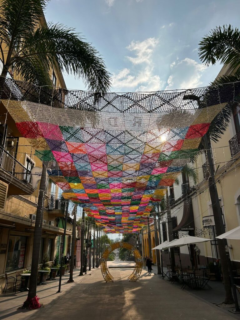 En la calle 1 avenidas 3 y 5 del Centro Histórico de Córdoba, están instalando un tapete aéreo tejido a mano por un grupo de mujeres cordobesas que fueron apoyadas por el alcalde Juan Martínez Flores.