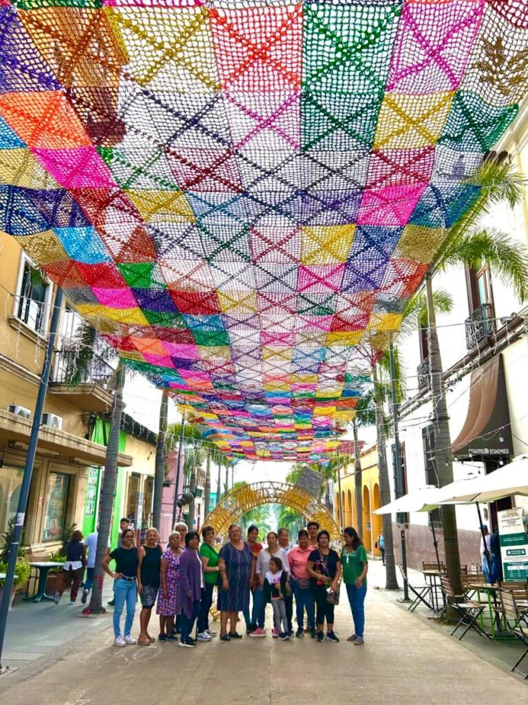 Más de 35 crocheteras elaboran tapete aéreo que encantan a visitantes