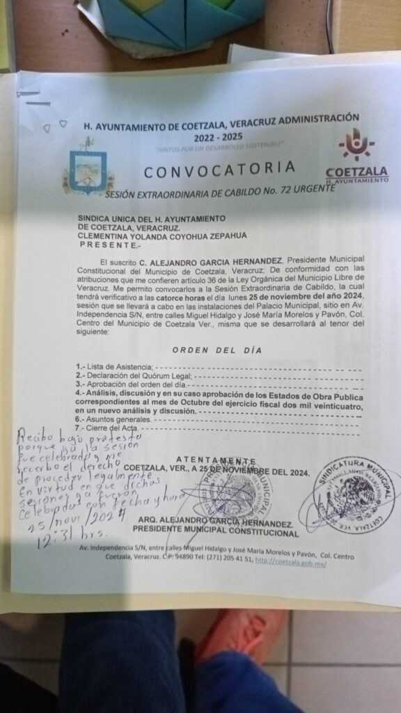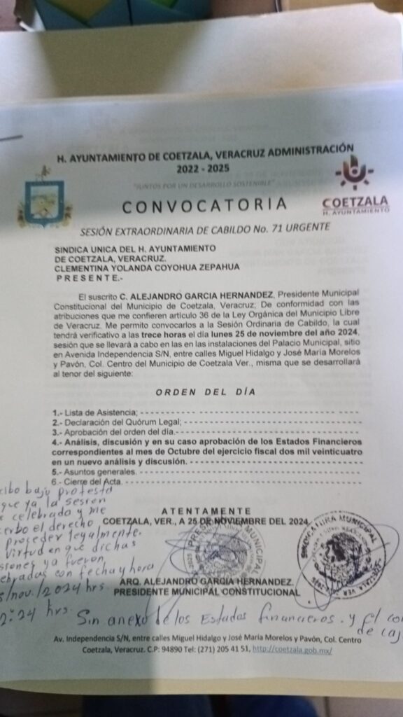 Coetzala, Ver.- Intenta presidente municipal, Alejandro García Hernández sorprender, nuevamente al Cabildo al convocar en carácter de “urgente” para este mismo 25 de noviembre a sesión con el propósito de aprobar estados financieros y avance de obras correspondiente al mes de octubre, puntos que no se aprobaron en pasada sesión que se celebró el pasado 22 de noviembre.