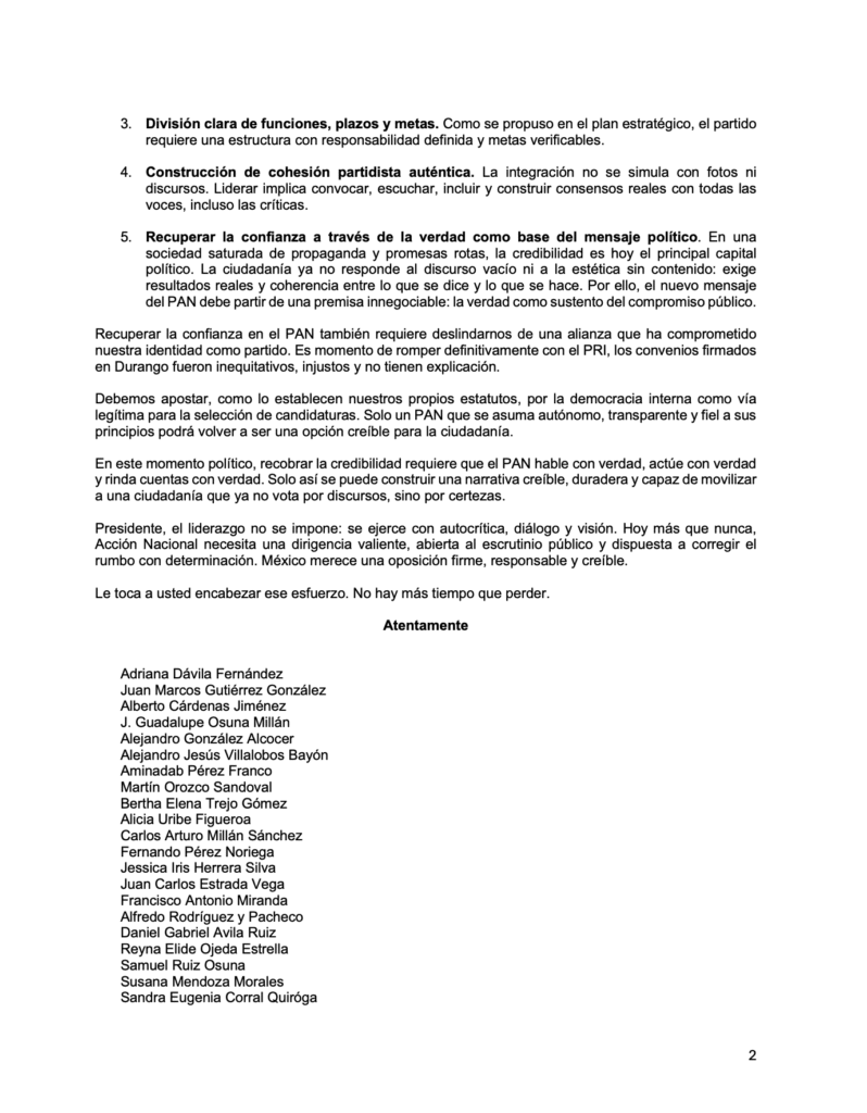 “En este momento político, recobrar la credibilidad requiere que el PAN hable con verdad, actúe con verdad y rinda cuentas con verdad. Solo así se puede construir una narrativa creíble, duradera y capaz de movilizar a una ciudadanía que ya no vota por discursos, sino por certezas”, se menciona.