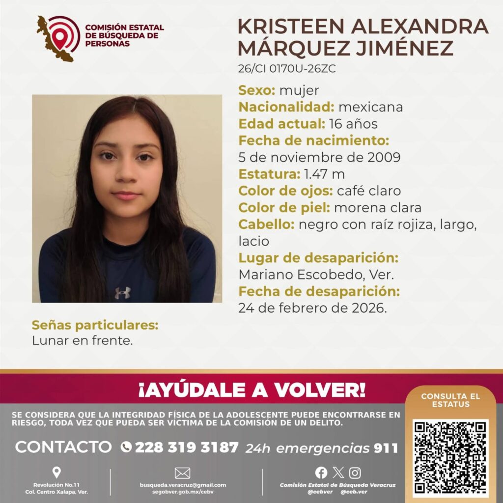 En un segundo hecho, familiares de Kristeen Alexandra Márquez Jiménez, de 16 años de edad, informaron que la menor fue vista por última vez el 24 de febrero en el municipio de Mariano Escobedo.