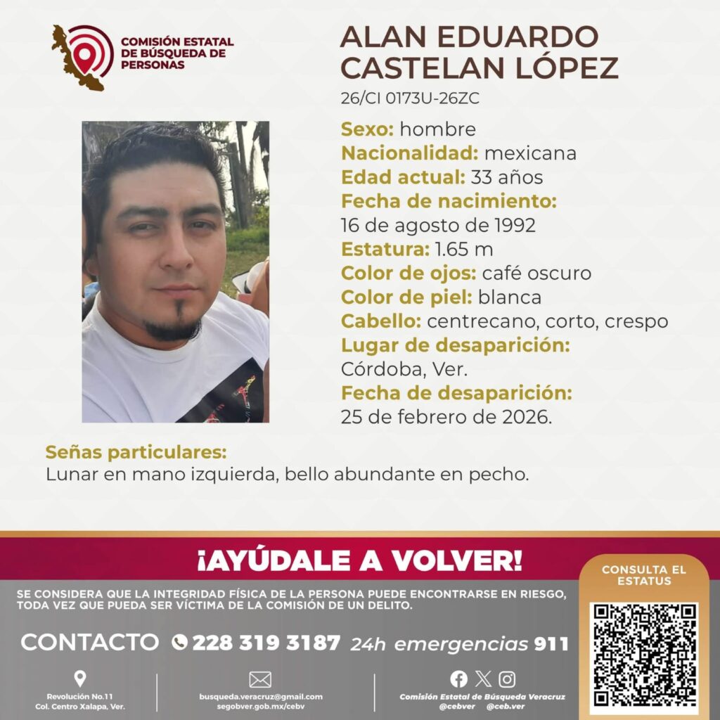 El primer caso corresponde a Alan Eduardo Castelán López, de 33 años de edad, quien fue visto por última vez el pasado 25 de febrero en la ciudad de Córdoba.