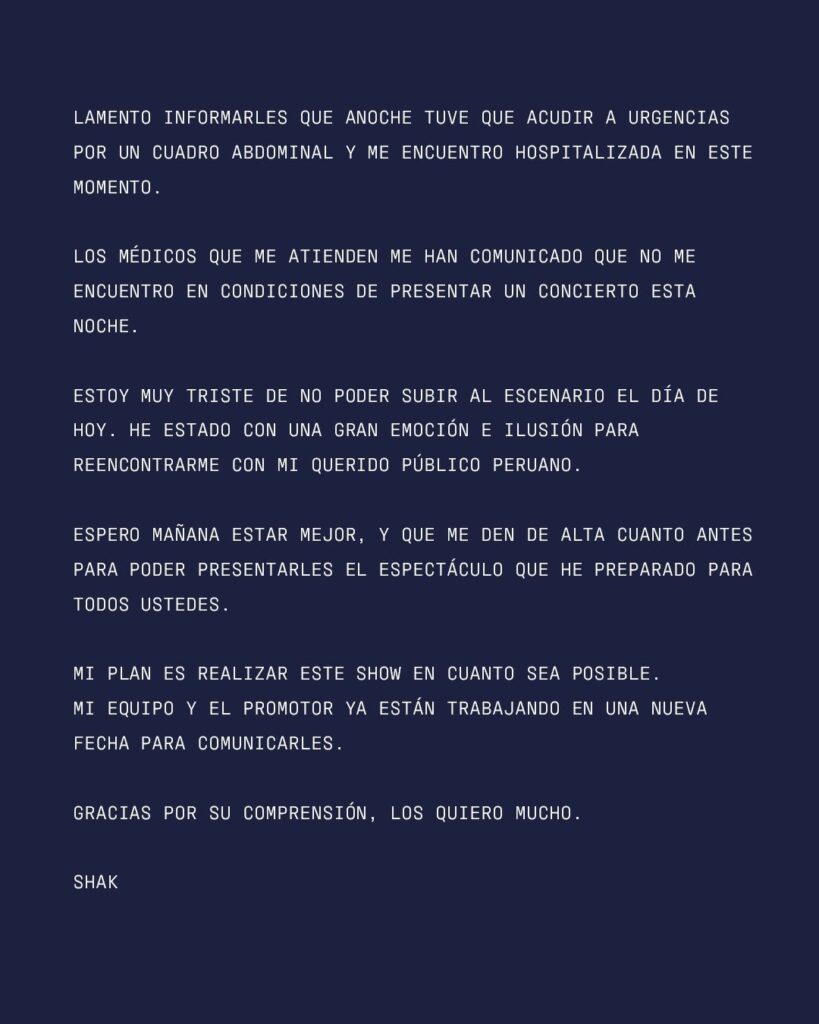 A pocas horas de su presentación en el Estadio Nacional, la cantante fue ingresada a una clínica por un cuadro de gastritis, lo que llevó a la cancelación del show. 🎤❌ #Shakira