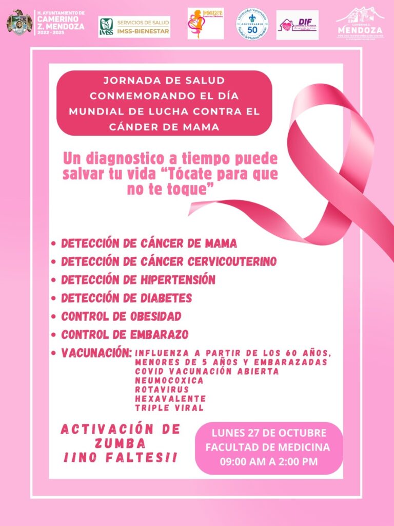 Camerino Z. Mendoza, Ver., 23 de octubre de 2025.- En el marco del Día Mundial de la Lucha contra el Cáncer de Mama, el lunes 27 del presente mes, se llevará a cabo una Jornada de Salud en la Facultad de Medicina de la Universidad Veracruzana, en un horario de 9:00 a 14:00 horas.