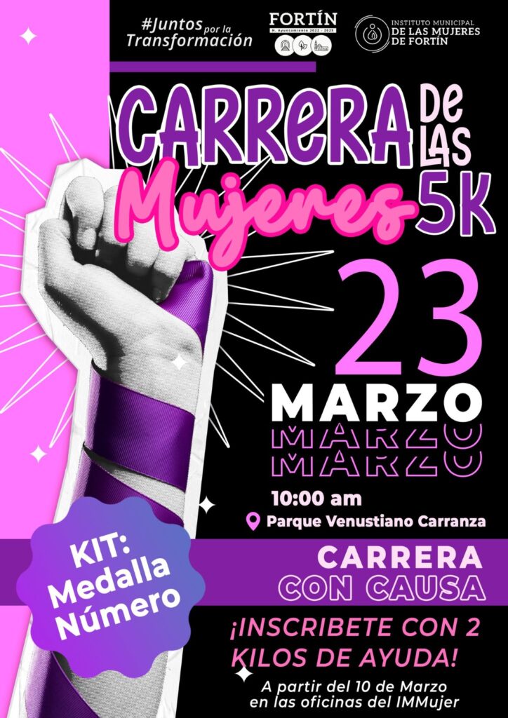 11 de marzo de 2025, Fortín, Ver., – El H. Ayuntamiento a través del Instituto Municipal de la Mujer invitan a todas las personas a que participen en la Carrera de las Mujeres 5 kilómetros, misma que se realizará con causa a fin de contribuir al apoyo de mujeres y familias fortinenses, la cuota de recuperación para esta carrera serán dos kilos de ayuda (frijol, arroz, azúcar).